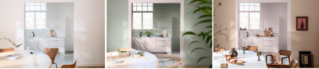 The time of completely white kitchens has passed! If you want to bring your kitchen back to life, try painting 1 or 2 walls with “Tender embrace”, the coulor of the year 2024 in combination with other complementary colours!